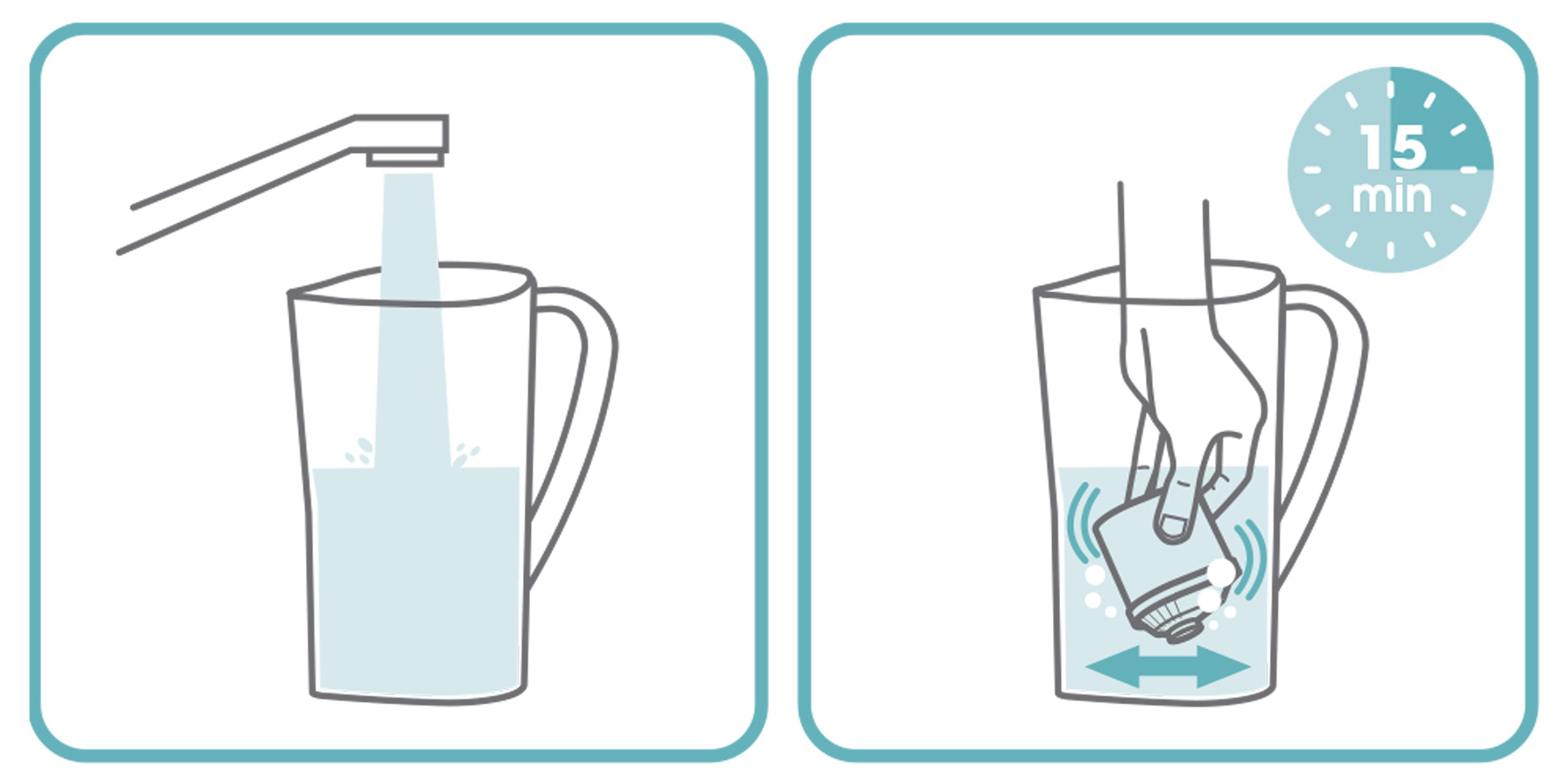 Llena la jarra o recipiente hasta la mitad y sumerge el filtro con el agujero pequeño de salida preferentemente hacia arriba hasta que suelte el aire que pueda contener. Si no quieres estar sosteniendo el filtro con la mano puedes colocarle encima el depósito para evitar que flote. Mantenlo sumergido durante 20 minutos.
