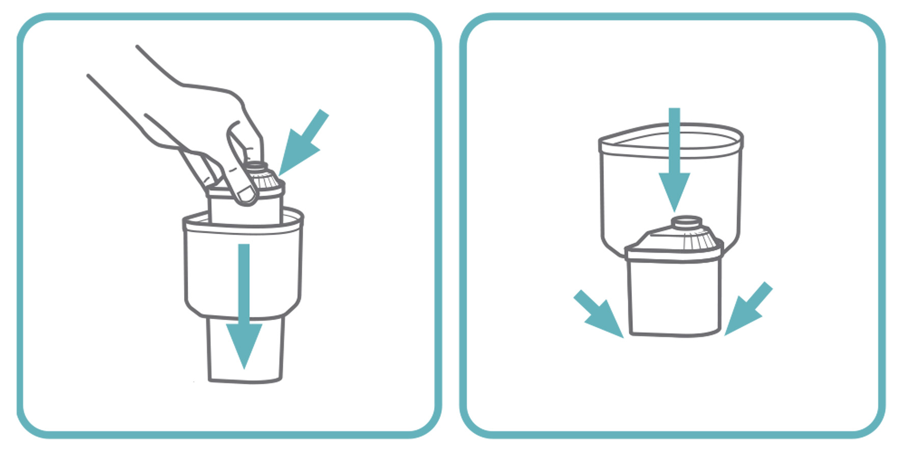 Recomendamos apoyar el depósito en una superficie estable, como una mesa e introducir el filtro en él, con la rejilla hacia arriba, tal y como se muestra en el dibujo. Introducimos el filtro en el depósito y presionamos para que este quede ajustado hasta el final de donde termina el hueco, quedando así a la misma altura depósito y filtro.