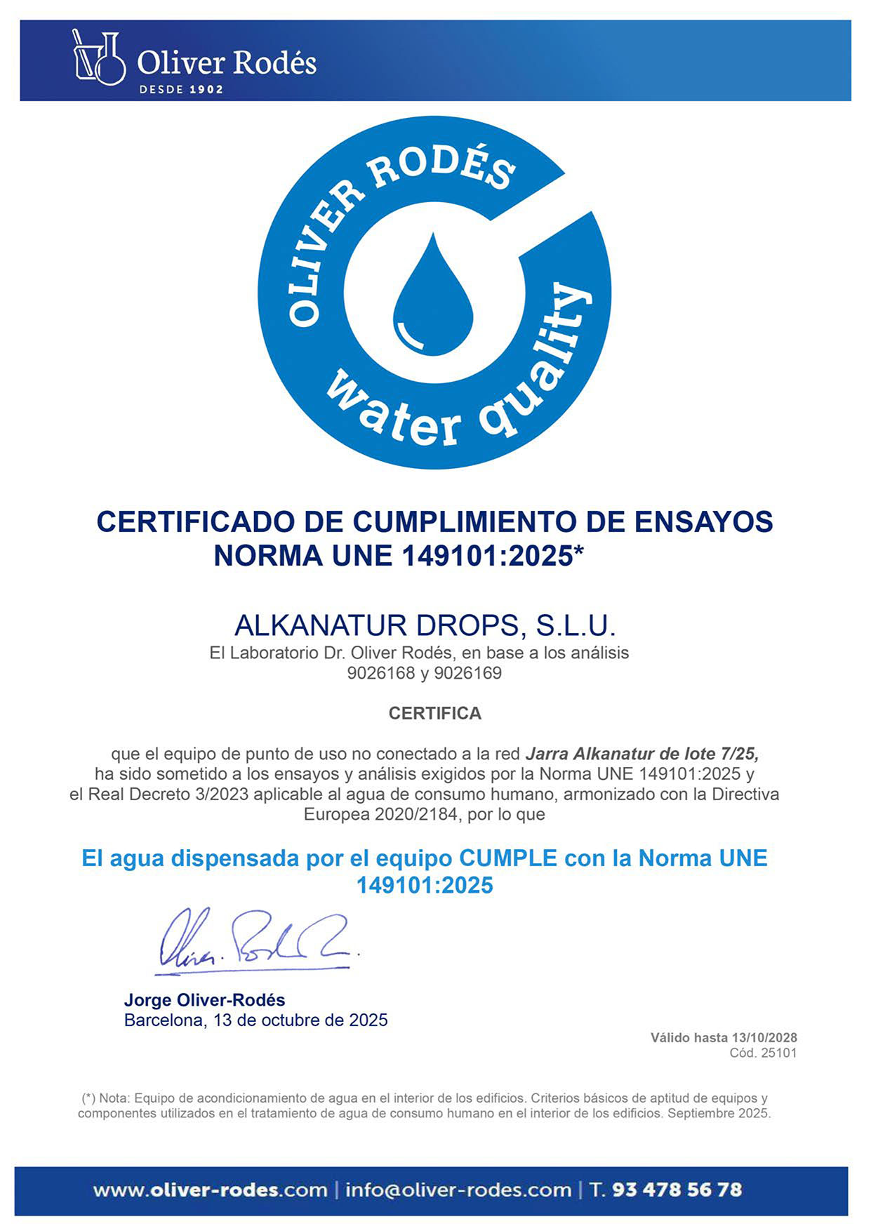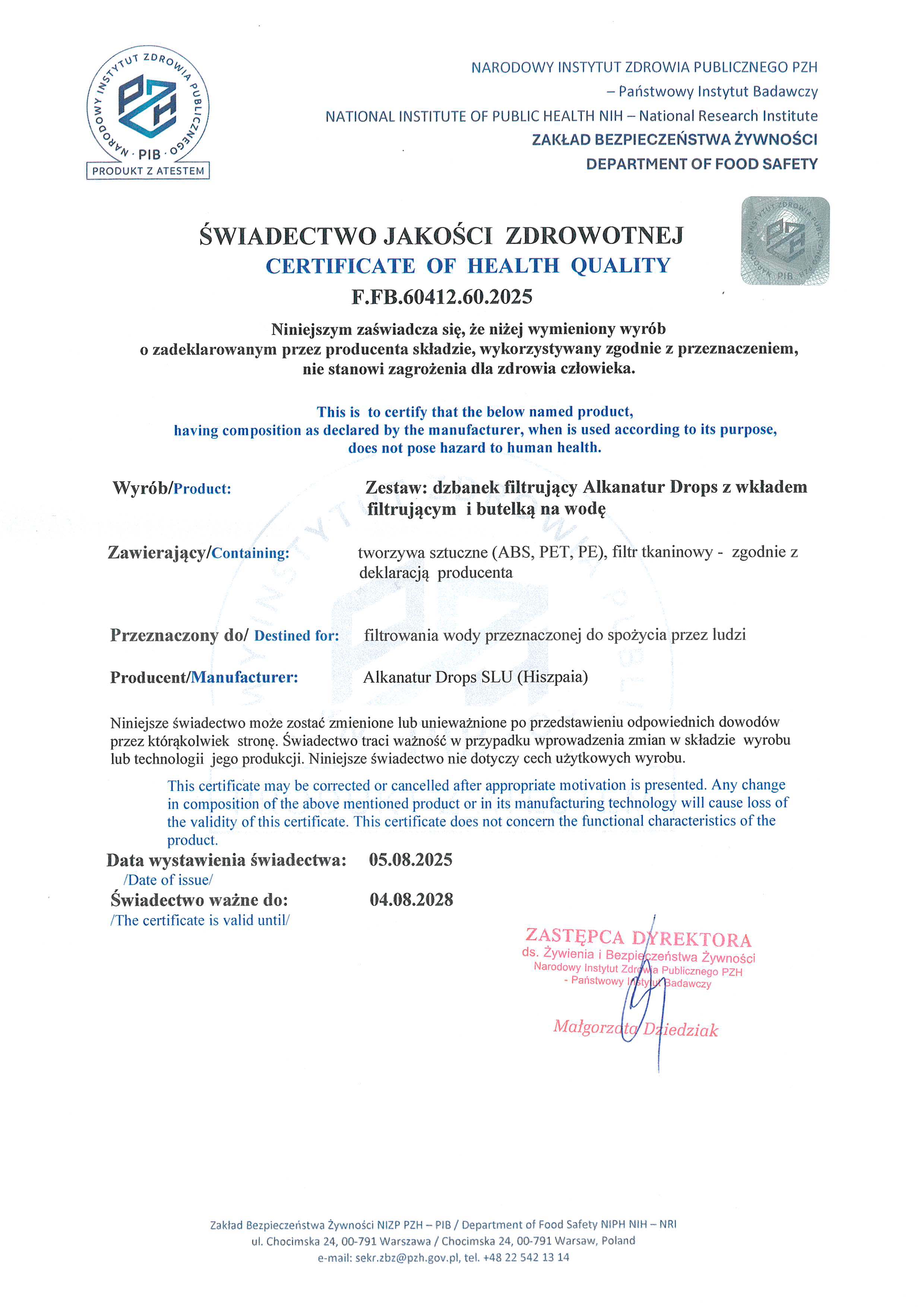 La jarra filtradora y filtros Alkanatur Drops® están respaldados por rigurosas certificaciones internacionales que avalan su seguridad y calidad. El Instituto de Biomedicina de Granada confirma que sus componentes no presentan actividad estrogénica ni androgénica, garantizando la ausencia de disruptores endocrinos. Además, el prestigioso laboratorio Oliver Rodés ha verificado, bajo la normativa UNE 149101*, que el producto está libre de más de 200 sustancias tóxicas. Por último, el Instituto Nacional de Salud Pública de Polonia, uno de los institutos más rigurosos y con mayor prestigio científico y sanitario de Europa, a través de su Departamento de Seguridad Alimentaria, certifica que la jarra y el filtro cumplen con los más altos requisitos de seguridad sanitaria, lo que otorga al certificado además un alto reconocimiento y credibilidad internacional.