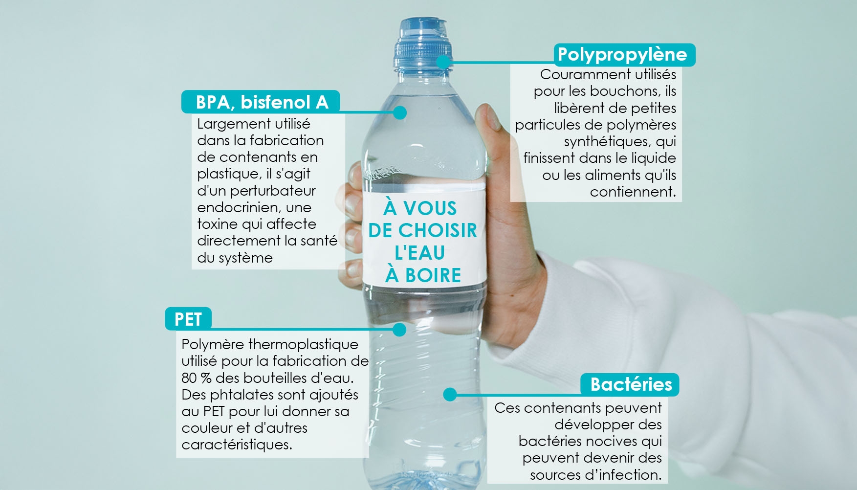 • Ne pas boire de l’eau embouteillée dans du plastique.